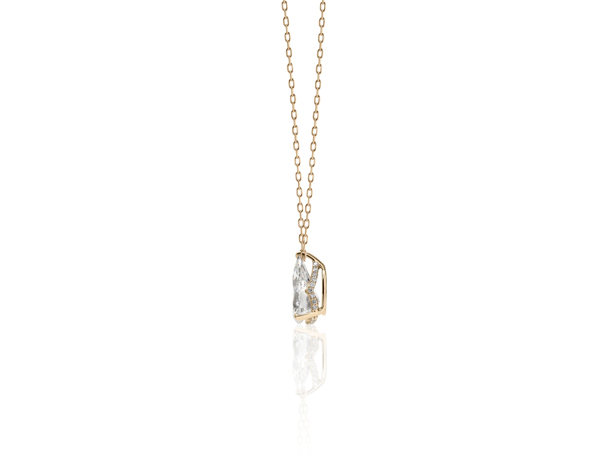 しずくのように流れるフォルムが、胸元でやさしく輝くペアシェイプ。
