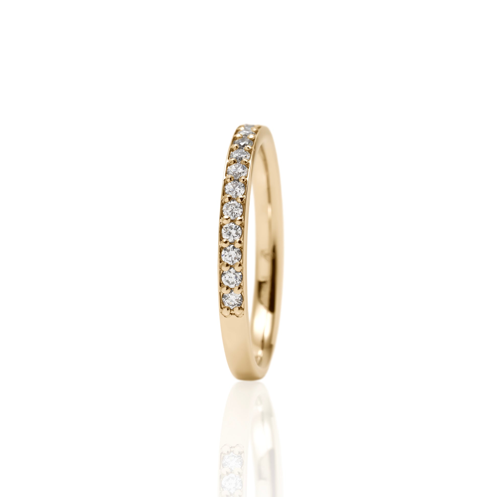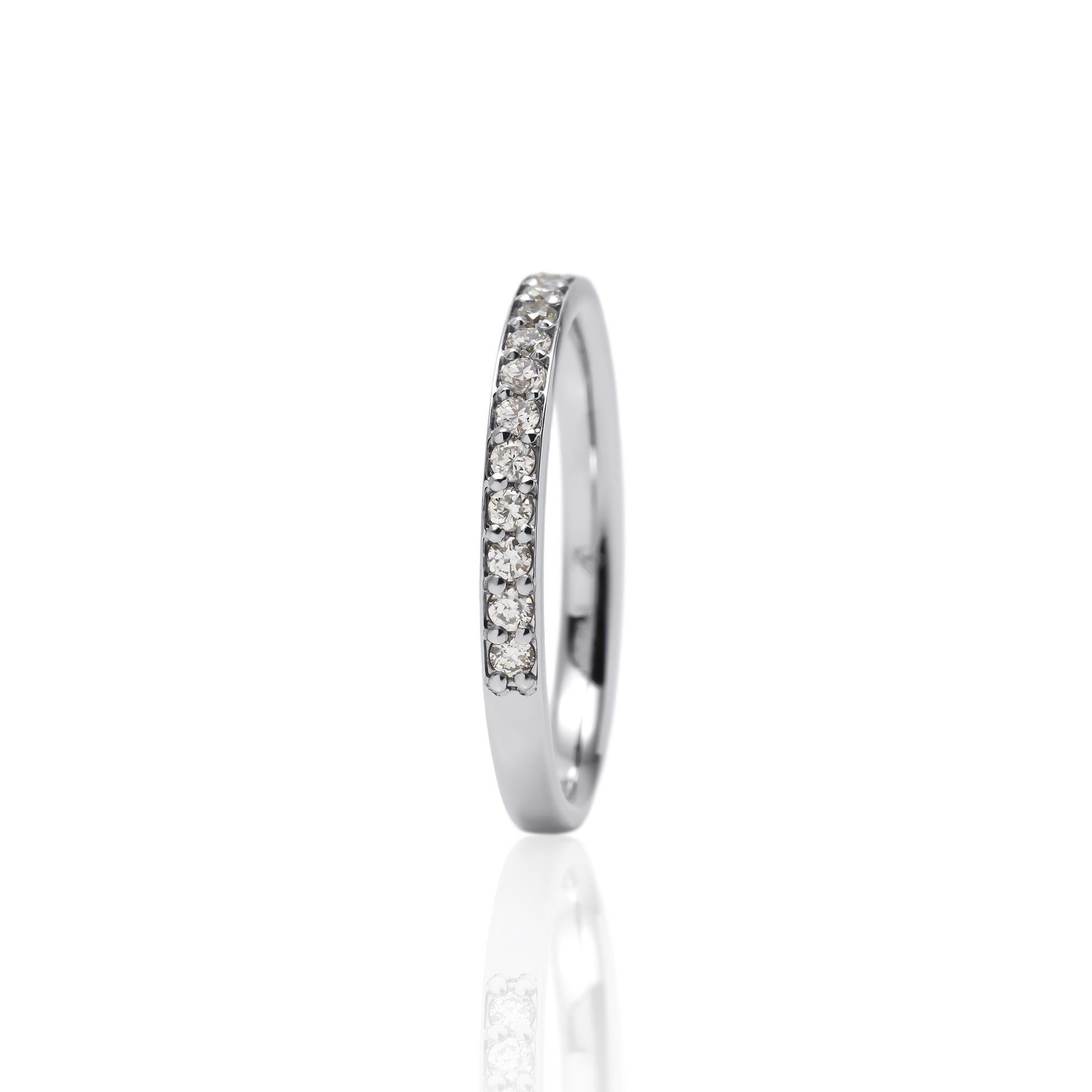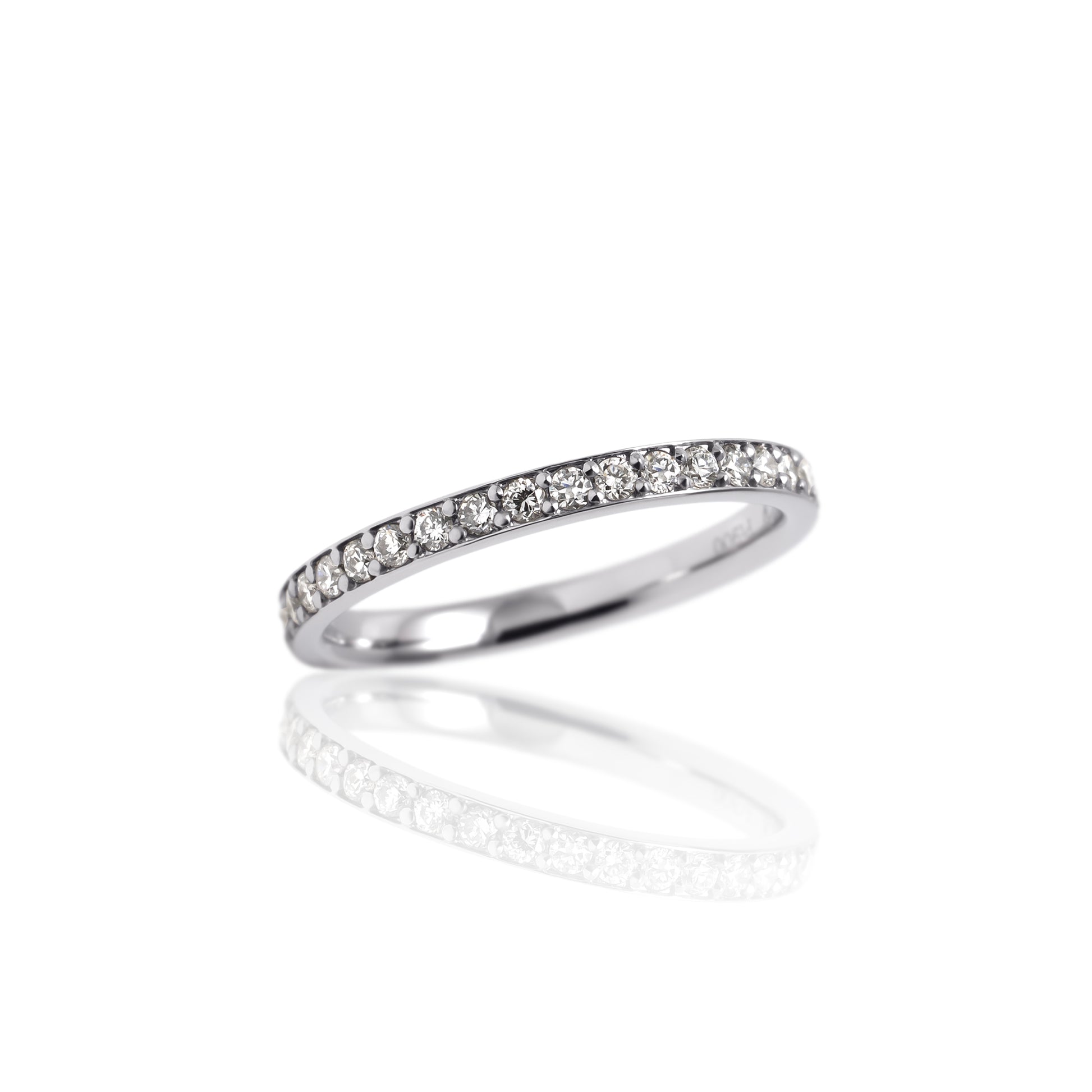 指を動かすたび、繊細な光がすっと流れるように輝くハーフエタニティリング。